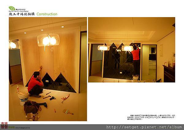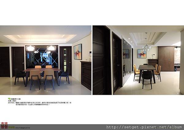 餐桌區主牆以菱形拼接的方式,用鏡子加大空間並增加現代感的主題性,