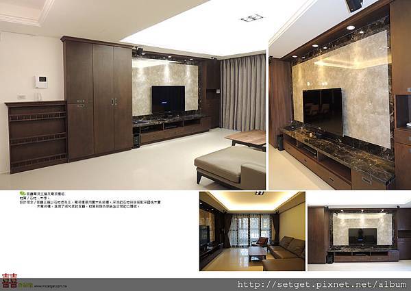 主牆採用實木較深色的顏色做搭配,石材也以兩種顏色跳色,有變化卻不花俏