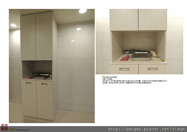 廚房內為了視覺不要一眼到底,在過道上擺放直立到頂的電器櫃作修飾,增加實用性