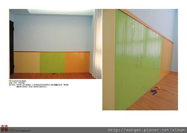 留了一個鋪木地板的房間,房間牆面預留給小孩繪畫的空間,