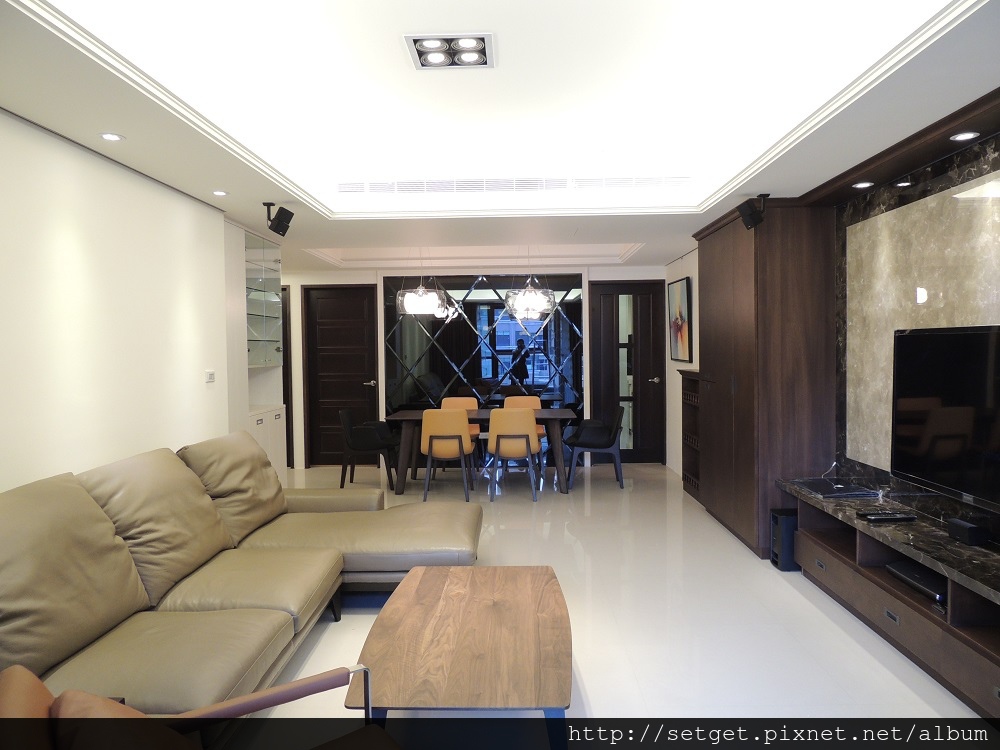 進入客廳後因為希望整體空間明亮所以壁面預留掛畫的軌道方便日後的裝飾,
